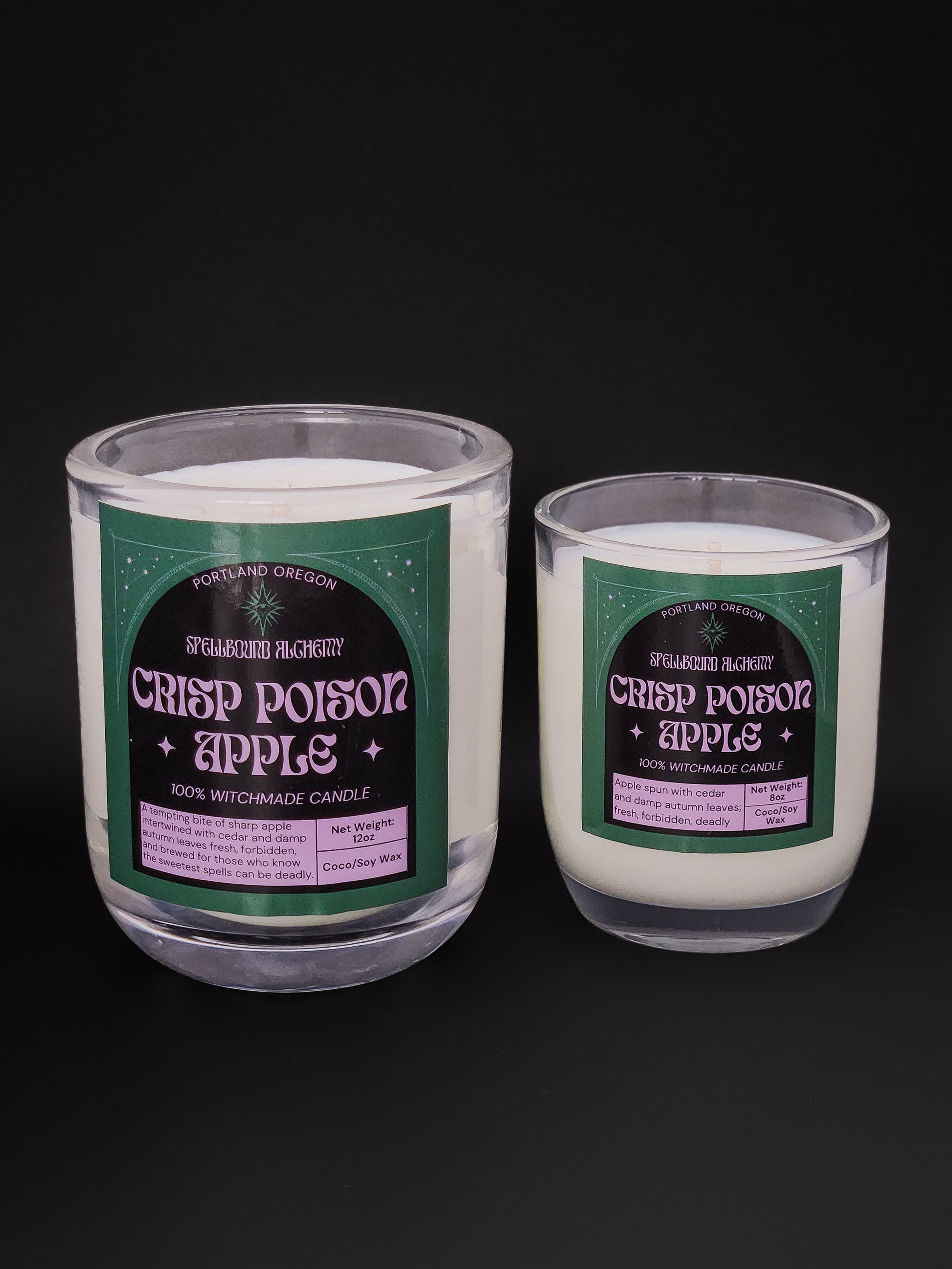Crisp Poison Apple is the scent of a storybook orchard just before the plot turns — bright, cold, and deliciously mysterious. This candle captures that enchanted moment when a perfect apple gleams in the autumn light, its surface crisp with morning frost and its heart filled with old folktale magic.